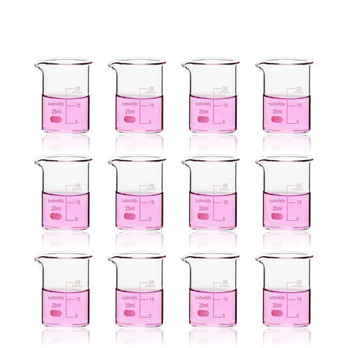 Labvida 12pcs of Glass Beakers Shot Glass, Vol.25ml, 3.3 Borosilicate Griffin Low Form with Printed Graduation, LVA001