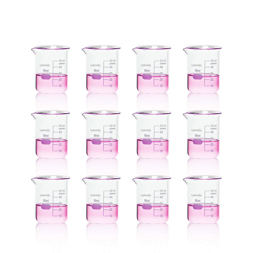 Labvida 12pcs of Glass Beakers Shot Glass, Vol.50ml, 3.3 Borosilicate Griffin Low Form with Printed Graduation, LVA003